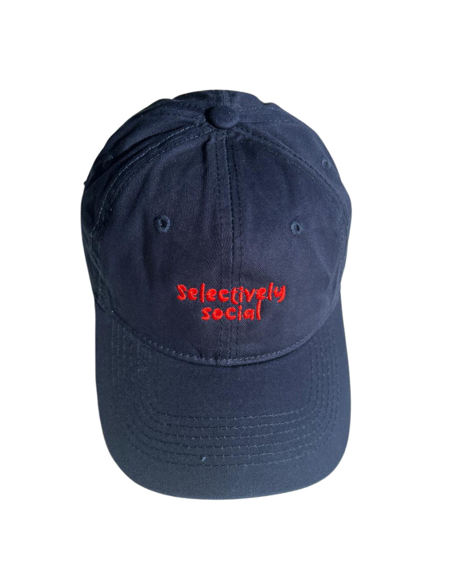 Stylish embroidered cap featuring the "Selectively Social" slogan. Perfect for adding a sassy statement to any outfit while keeping your look on-trend. Express your personality with this conversation-starting accessory.
