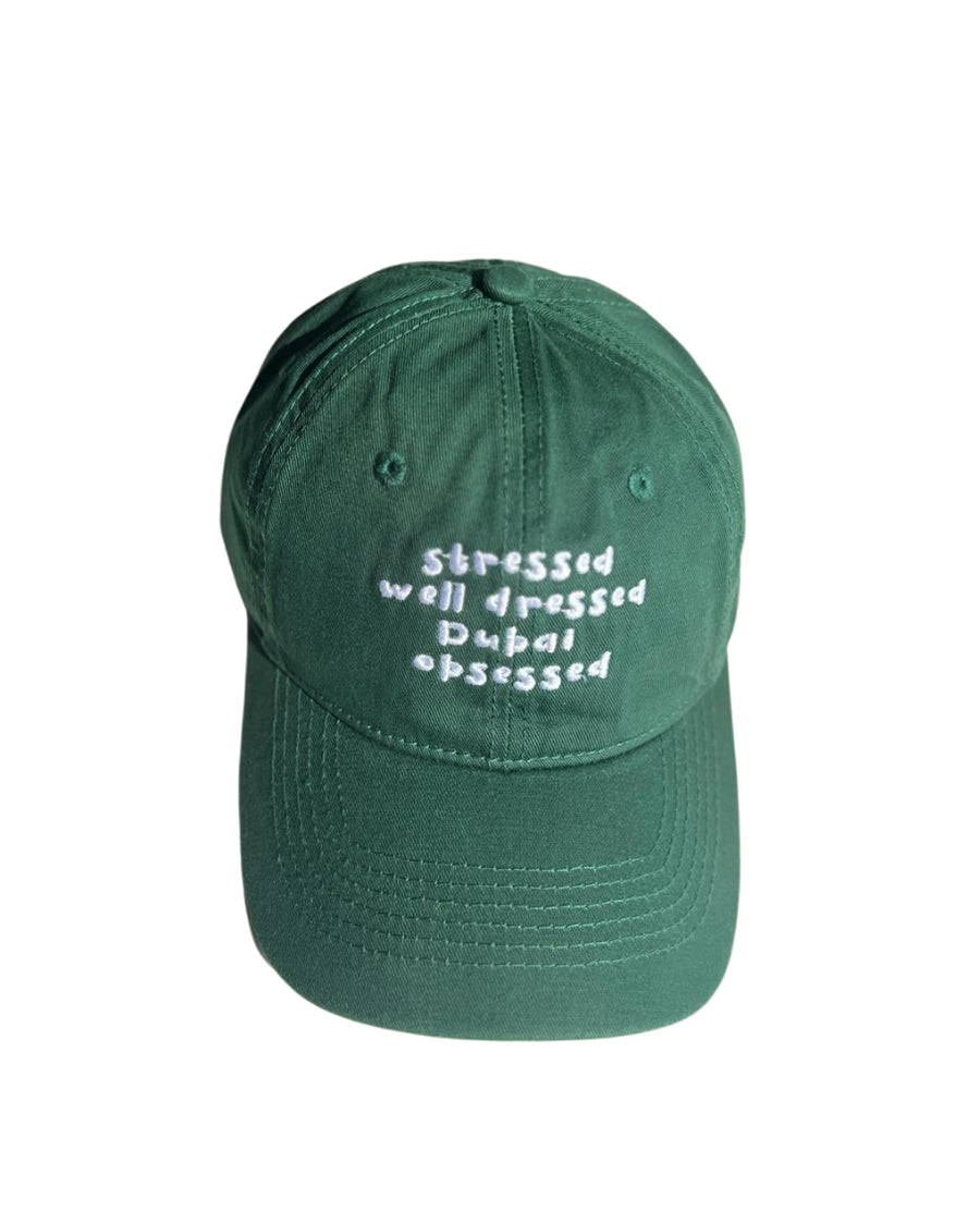 Chic cotton cap with "Stressed Well Dressed Dubai Obsessed" embroidery. Turn heads and spark convos with this must-have accessory that perfectly captures your Dubai love in one stylish statement piece.